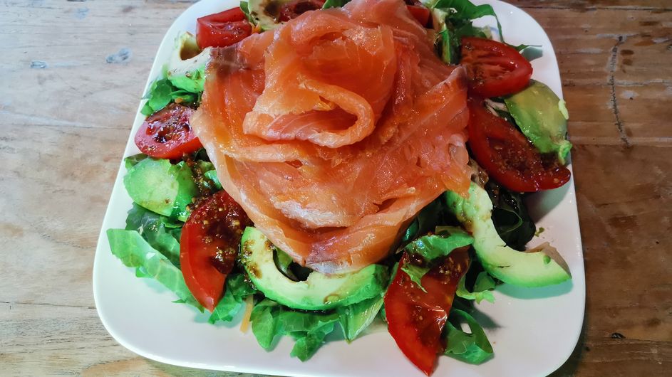 | 5 | Maak je salade verder af met de avocado, tomaten en gerookte zalm |