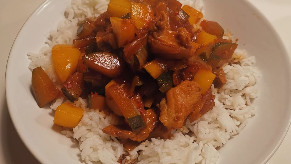 | 3 | Voeg de ketjap, tomatenpuree, sambal en het sap van de perziken toe |