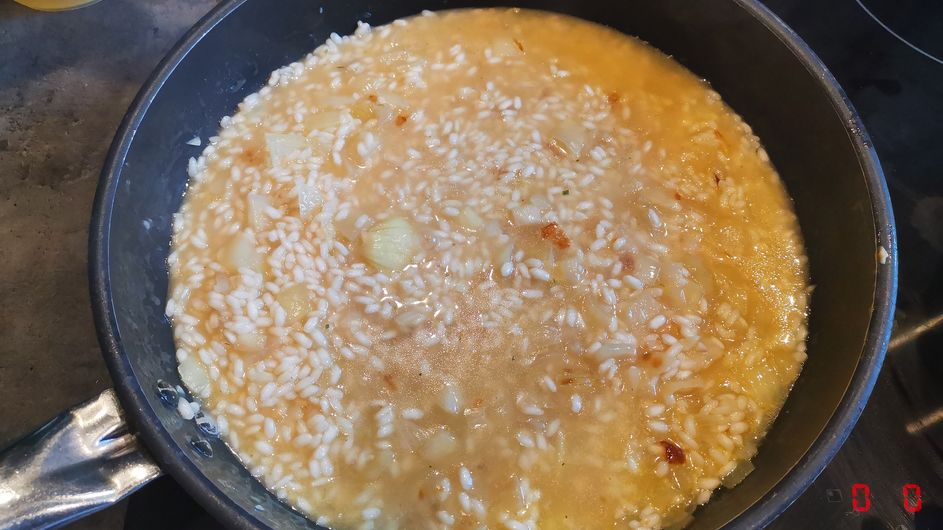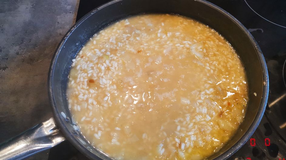 | 3 | Doe de risottorijst erbij en bak 2 minuten mee tot de korrels glazig zijn |
