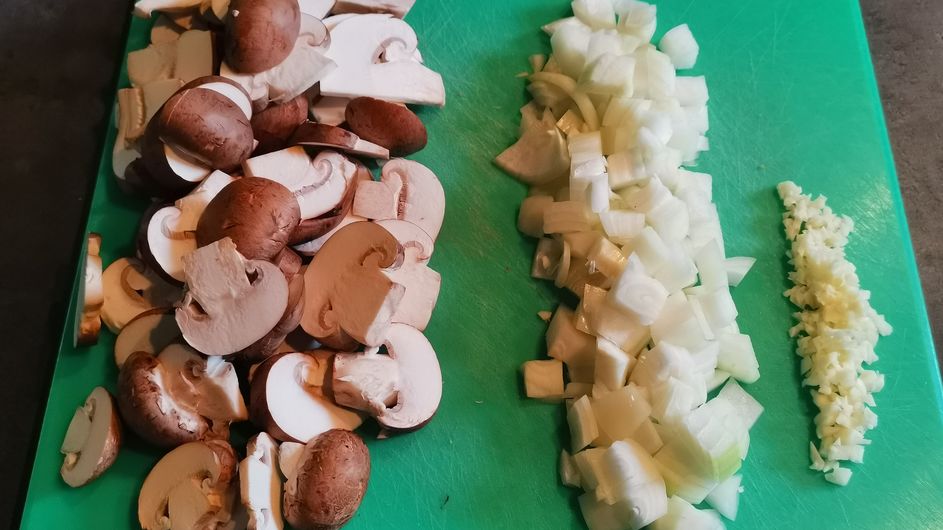 | 1 | Snipper de ui en knoflook. Snij de champignons in plakjes |