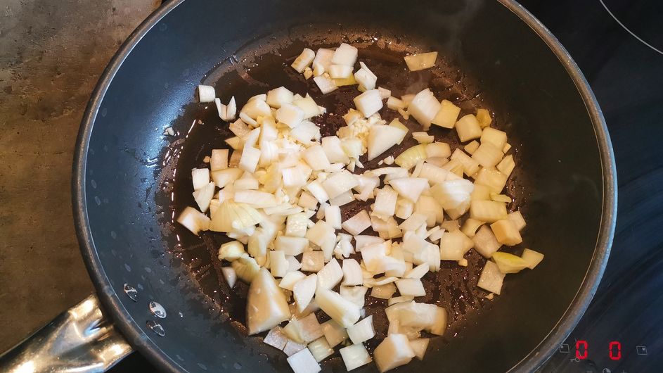 | 2 | Bak de ui en knoflook 1 minuut aan |