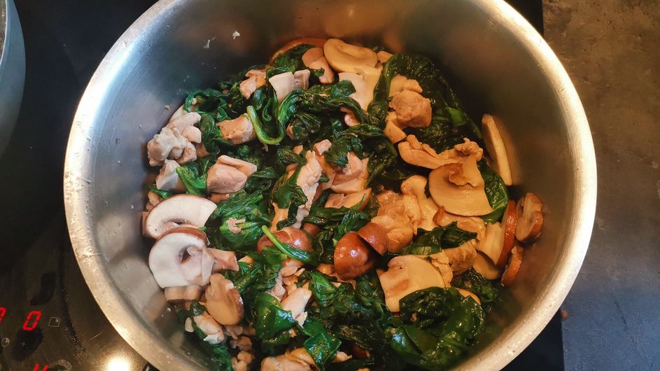 | 9 | Voeg de spinazie in delen toe en laat al omscheppend slinken |