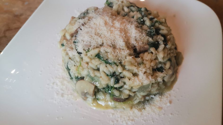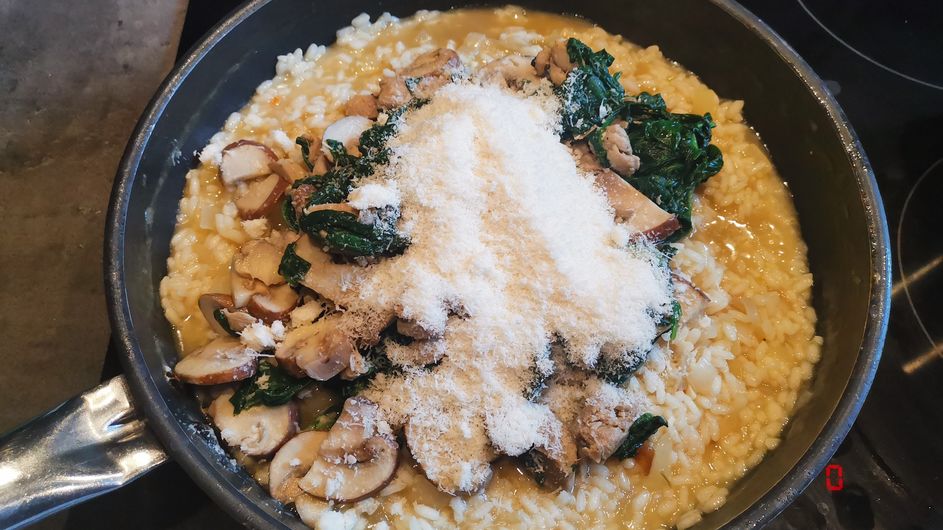 | 10 | Schep de champignons en spinazie met de helft van de kaas door de risotto |